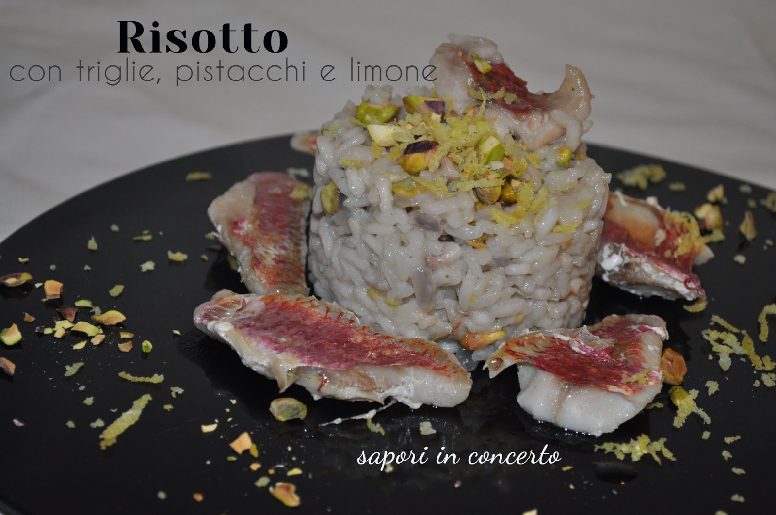 Cinque minuti prima della fine della cottura del risotto, aggiungete i filetti delle 5 triglie rimaste, crude e senza pelle, tagliate a tocchetti, una parte di pistacchi e una parte della buccia di limone.